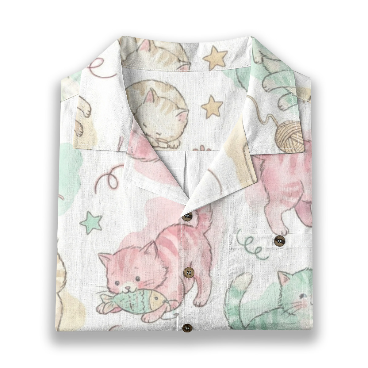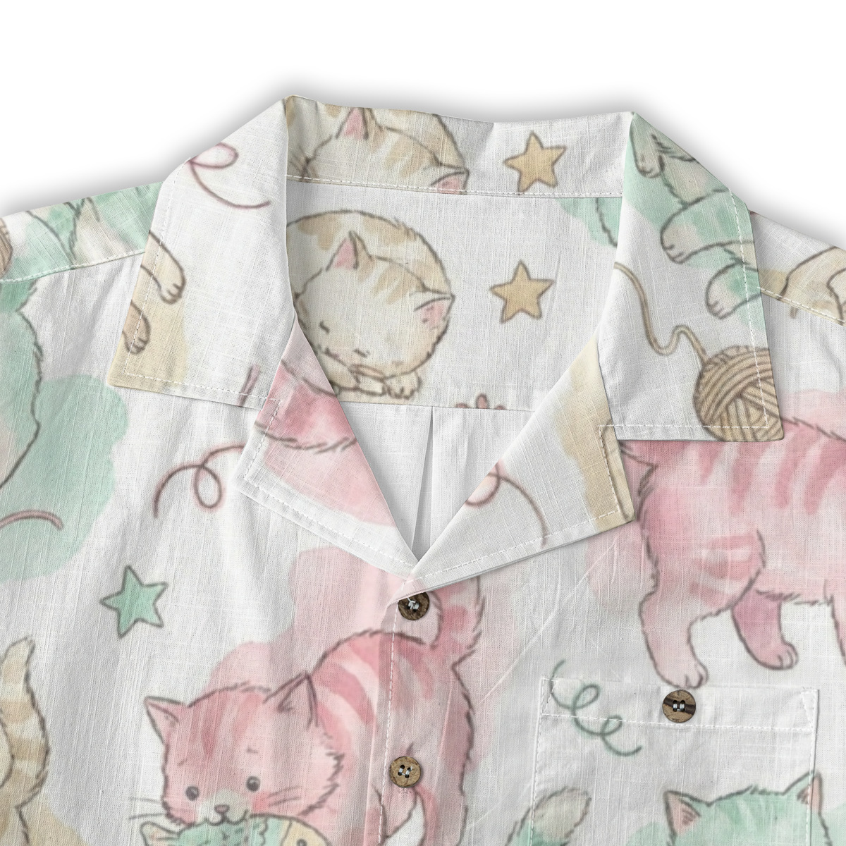 This charming Hawaiian shirt features an adorable pastel kitten illustration that instantly brings a soft, playful, and heartwarming vibe.