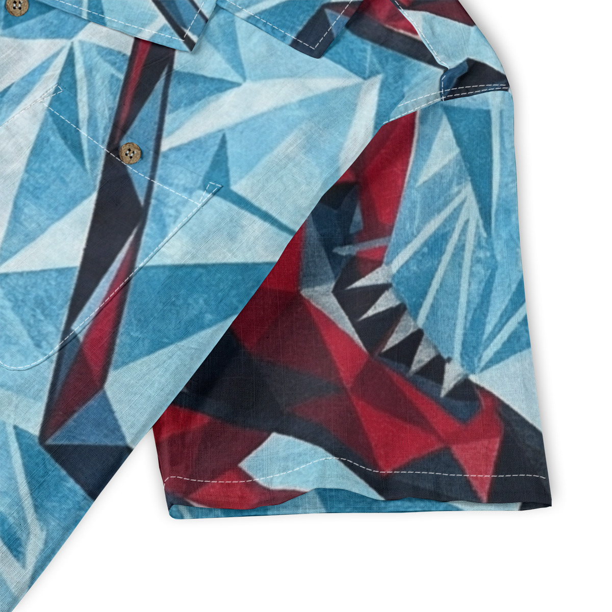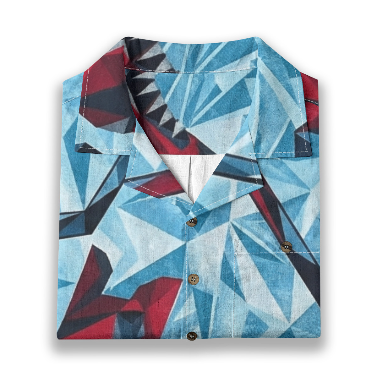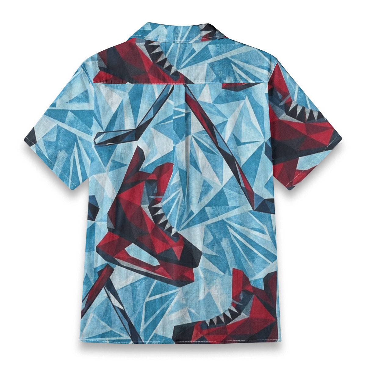 This Hawaiian shirt features bold geometric sharks rendered in sharp, angular forms against an icy blue background.