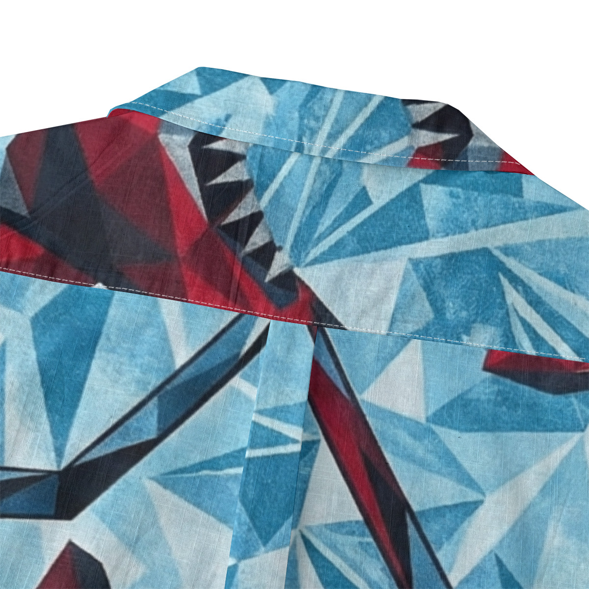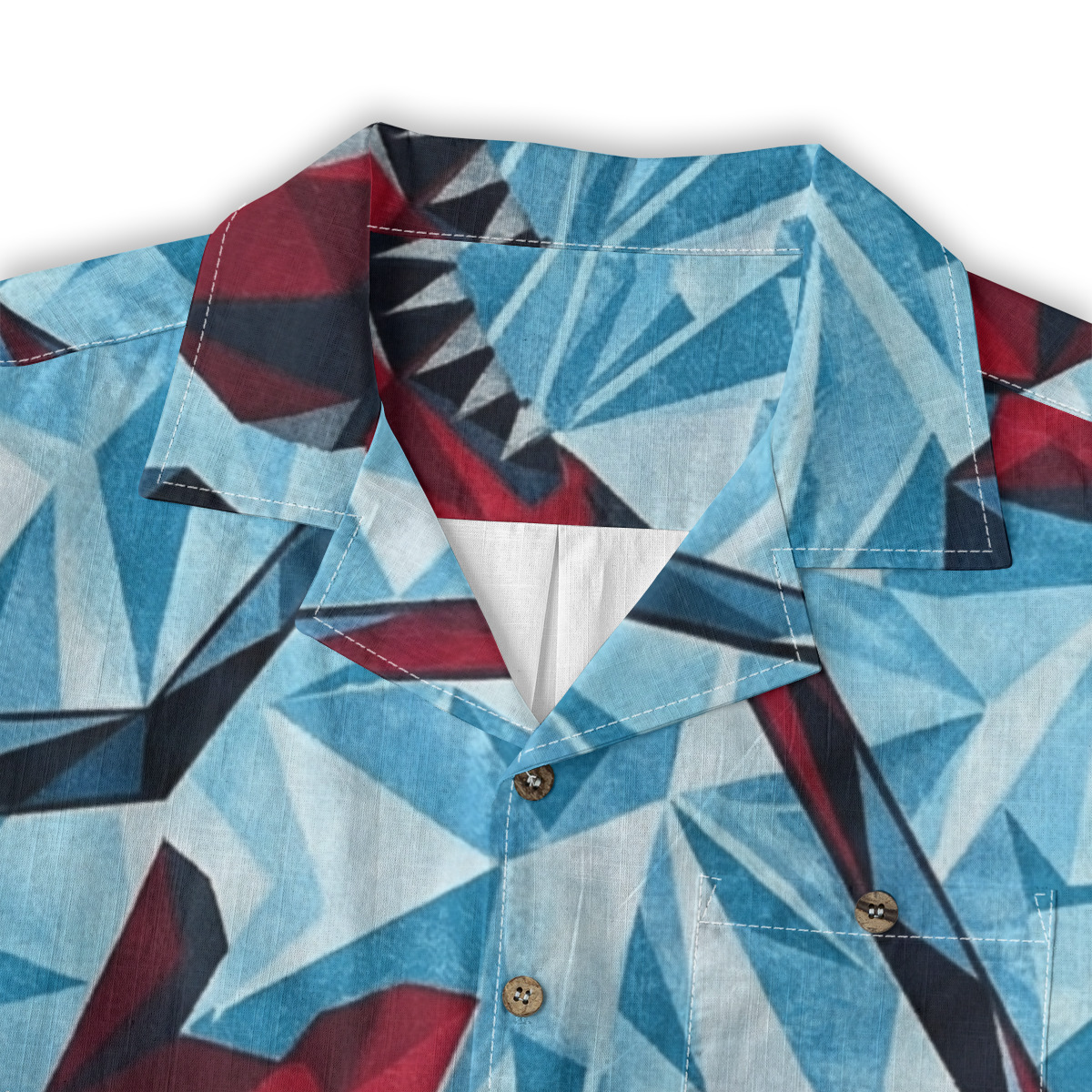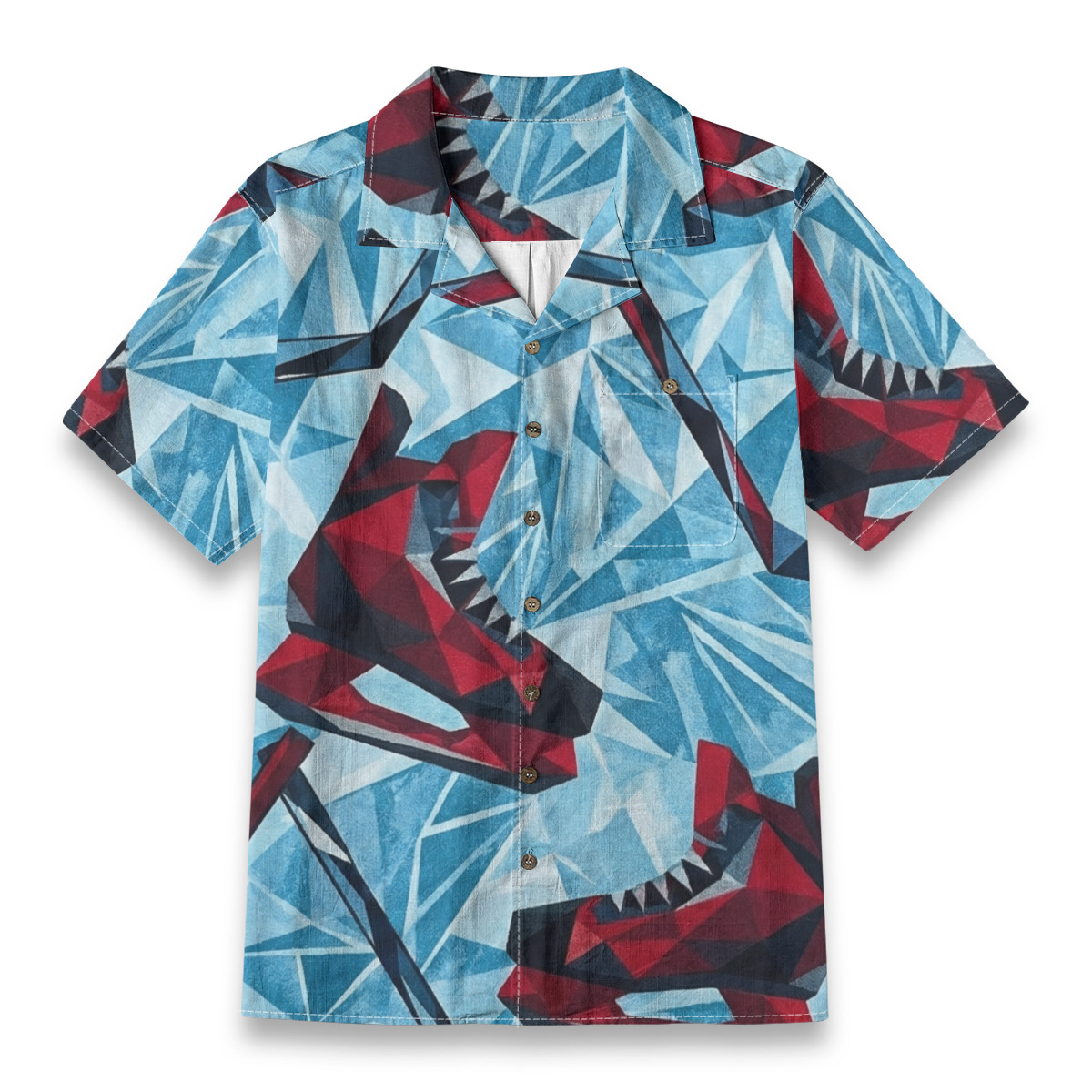 This Hawaiian shirt features bold geometric sharks rendered in sharp, angular forms against an icy blue background.