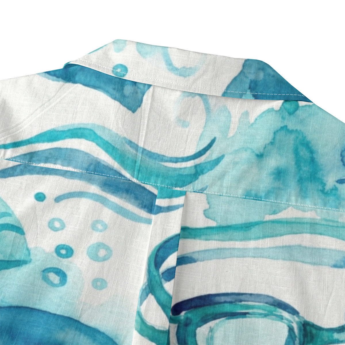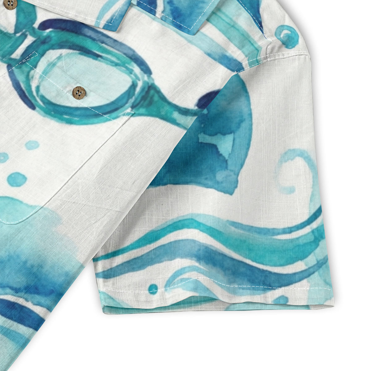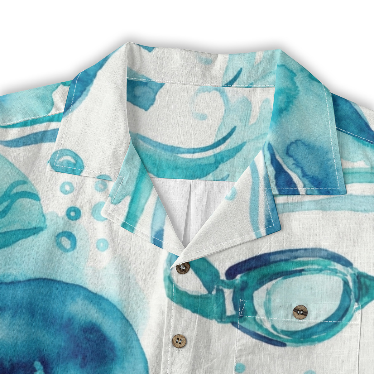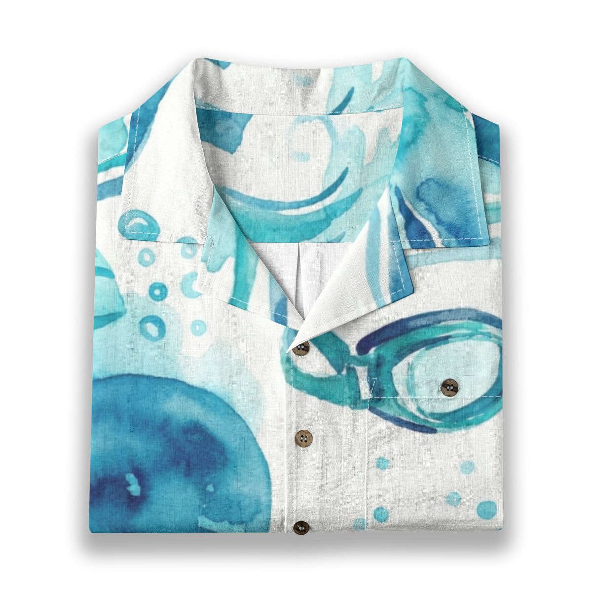 This Hawaiian shirt features a refreshing watercolor design inspired by swim goggles, flowing waves, and ocean bubbles.